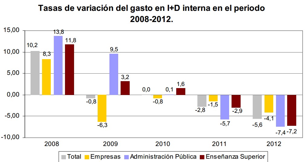 Según la Estadística sobre actividades de I+D del INE presentada este jueves en Madrid, el gasto interno en I+D ascendió en 2012 a 13.392 millones de euros (un 5,6% menos que en 2011). Esta cifra representa un 1,30% del PIB, frente al 1,36% de un año antes.