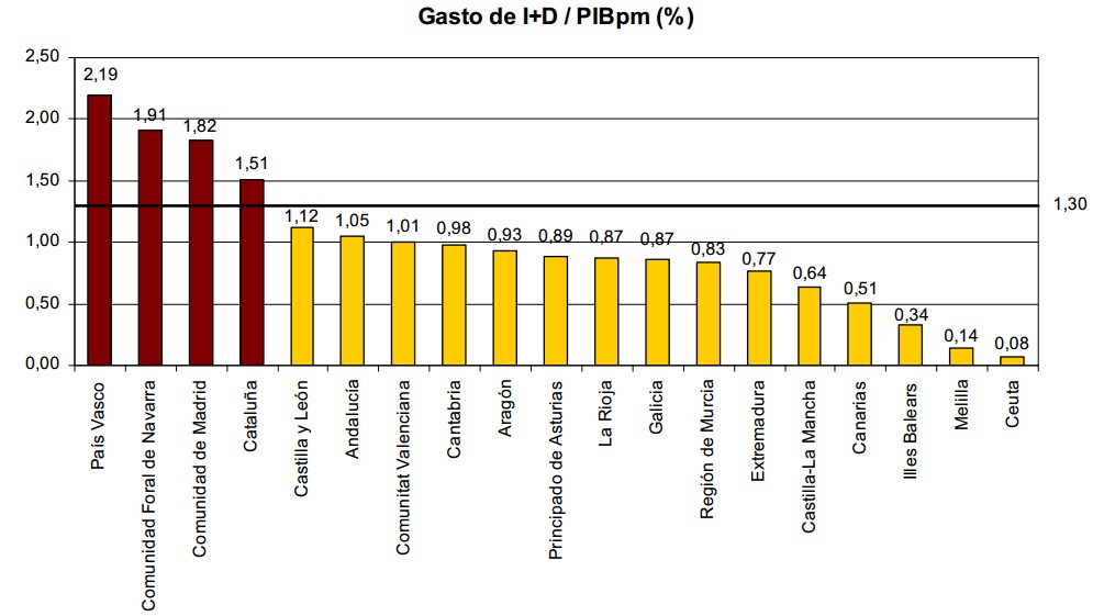 Por comunidades autónomas, sólo País Vasco, con un 2,19% del PIB dedicado a estas actividades, presenta una cifra europea. Tras esta región, aparecen Navarra (1,91%) y Madrid (1,82%). Mientras tanto, Canarias (0,51%) o Baleares (0,34%) cierran la lista.