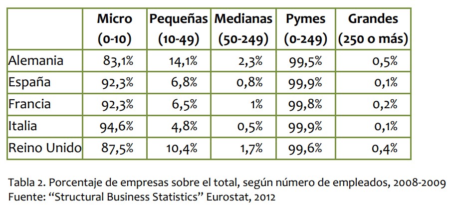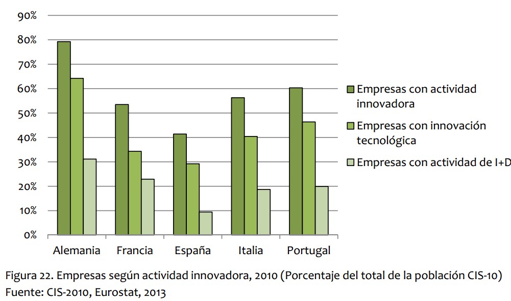 Los datos incluidos en el informe de Cotec La innovación española en 2020 confirman esta tendencia. Sólo el 7,7% de las empresas españolas tienen más de 10 empleados, mientras que las alemanas son el 17%. En general, en el país germano el tamaño de las compañías es mayor en todas las categorías y esto se acaba notando, y mucho, en su disposición a la I+D (aunque está claro que no es el único factor): "Por lo que respecta al porcentaje de empresas con actividades innovadoras, la situación española es también desfavorable respecto a otras economías europeas. Así, en 2008, mientras que el 80% de las empresas alemanas con más de diez empleados afirmó realizar este tipo de actividad, en España no llegó a la mitad. Hicieron innovación tecnológica solamente el 32% de las empresas españolas frente al 64% de las alemanas, y las que realizaron actividades de I+D apenas sobrepasaron el 11%, mientras que en Alemania eran el 31%".