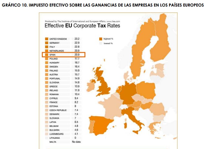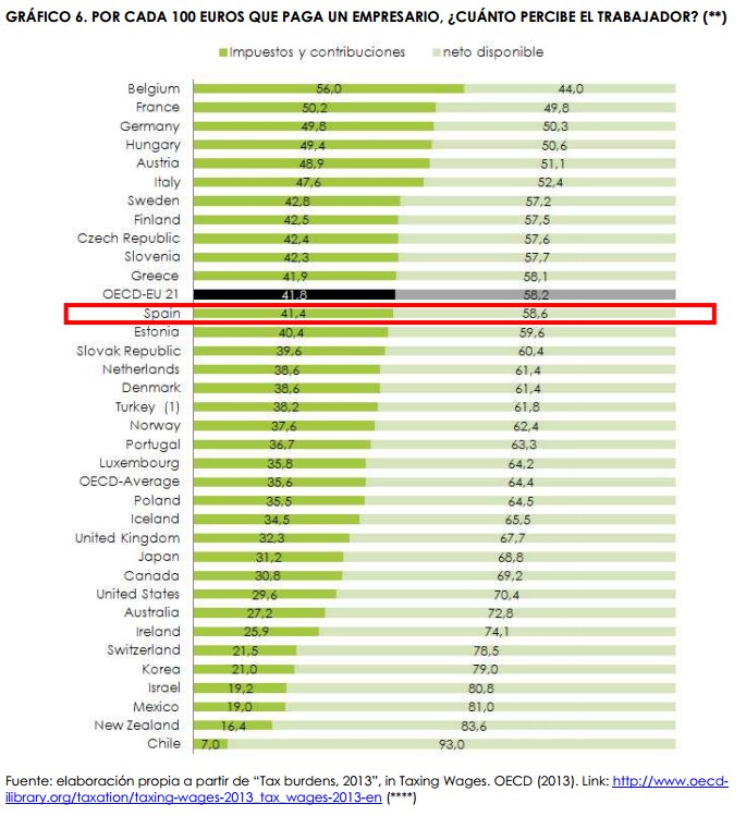 España es uno de los países con las cotizaciones sociales más elevadas (29,9%), con unos tramos de IRPF que más penalizan a partir de cantidades muy bajas y con un impuesto efectivo sobre las ganancias (20,9%) que está entre los cinco más elevados de la UE. Por ejemplo, de cada 100 euros que paga un empresario, al trabajador le llegan 58,6 euros. Es cierto en Alemania o Suecia lo que se queda su Hacienda directamente de la nómina es más que en España. Pero en países como Dinamarca, Holanda o Noruega, por poner tres ejemplos, el peso de impuestos directos y cotizaciones es menor que en España.