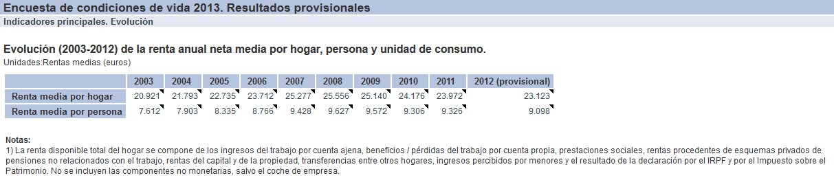 Los resultados provisionales de la Encuesta de Condiciones de Vida publicados este miércoles por el Instituto Nacional de Estadística (INE) reflejan que el ingreso medio anual neto por hogar en España se situó en 23.123 euros en 2012, con una disminución del 3,5% respecto al año anterior. Mientras, el ingreso medio por persona alcanzó los 9.098 euros, cifra un 2,4% inferior a la registrada el año precedente.