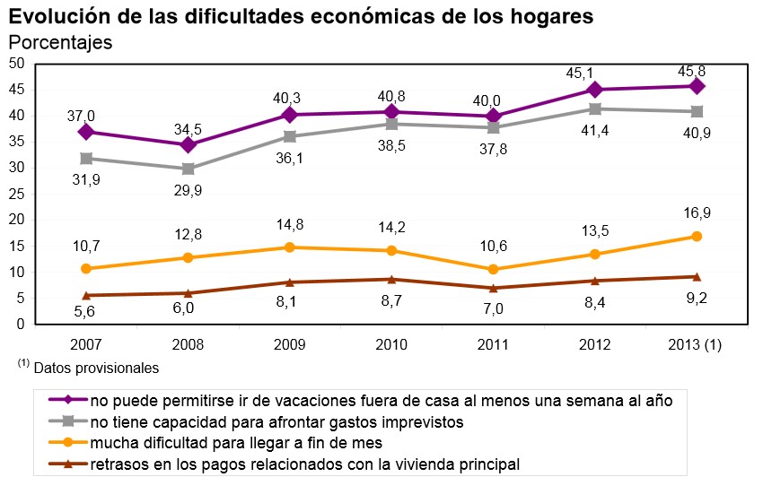 Por otro lado, según la encuesta, el 16,9% de los hogares españoles manifiesta llegar a fin de mes con "mucha dificultad" en 2013, el porcentaje más alto registrado en todo el periodo de crisis. En 2012, los hogares que expresaban mucha dificultad para llegar a fin de mes eran el 13,5%, es decir, 3,4 puntos menos que los que se encuentran en esta situación este año. En 2007, los hogares que llegaban a final de mes con mucha dificultad eran el 10,7%, porcentaje que subió durante 2008 (12,8%) y 2009 (14,8%) y que descendió en 2010 (14,2%) y 2011 (10,6%) para volver a repuntar hasta el nivel récord del 16,9% alcanzado este año.