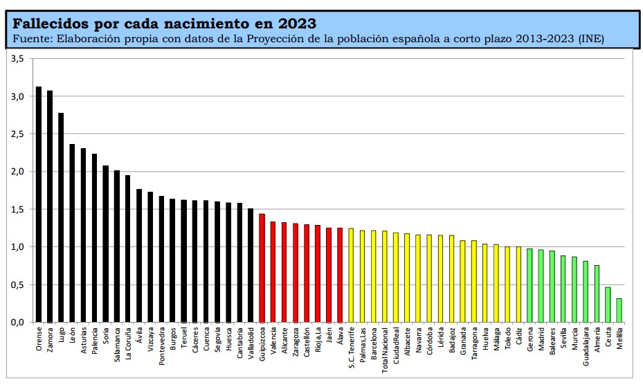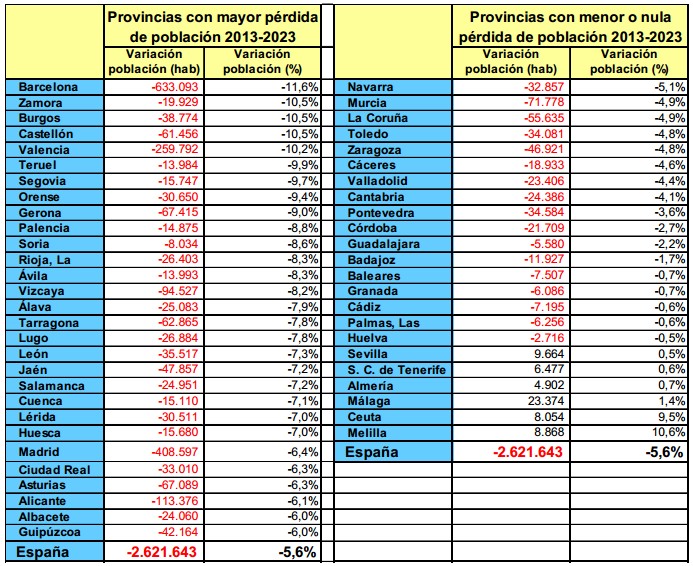 A este respecto, la Fundación Renacimiento Demográfico señala que, según estos mismos datos, todas las provincias perderán población, a excepción de Almería, Málaga, Santa Cruz de Tenerife, Sevilla, Ceuta y Melilla. Barcelona será la provincia que más población perderá durante este período, tanto en téminos absolutos como relativos.