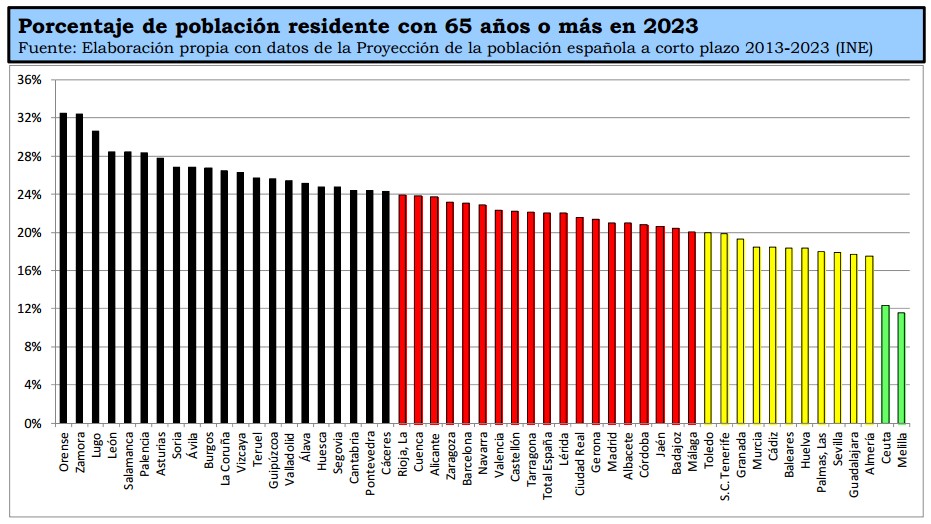 Este declive demográfico tendrá importantes implicaciones para la sostenibilidad del denominado Estado del Bienestar, especialmente en materia de pensiones, cuyo coste supera ampliamente los 100.000 millones de euros al año. Así, según las previsiones del INE, España habrá pedido en 2023 casi 4,1 millones de personas menores de 65 años respecto a las existentes en 2013, lo que supone una caída del 11%, mientras que el número de personas con 65 años o más crecerá en 1,5 millones (+18%). El porcentaje de población con 65 años o más pasará del 17,7% actual al 22% en 2023, siendo en un tercio de las provincias del 25% o superior.