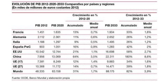 El informe revela que, aunque España no recuperará el ritmo de crecimiento previo a la crisis, su economía crecerá en los próximos veinte años por encima de los países del euro. En concreto, el PIB rozará los 1,3 billones dentro de 20 años y tendrá un crecimiento acumulado del 42%, por encima de Alemania (26%), Italia ( 26%) y Francia ( 33%). Sin embargo, la economía española no será capaz de recuperar antes de 2033, el ritmo de crecimiento previo a la crisis y hasta ese año no superará el 2% de media anual.