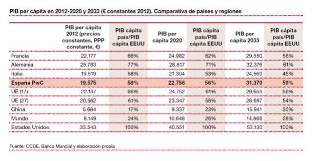 Mientras que en 2012, el PIB per cápita de España se situó en 19.575 euros, en 2033 ascenderá a 31.370 euros. Hay que dejar claro que este informe incide en la ralentización del resto de las grandes economías europeas para hacer estas comparativas con España.