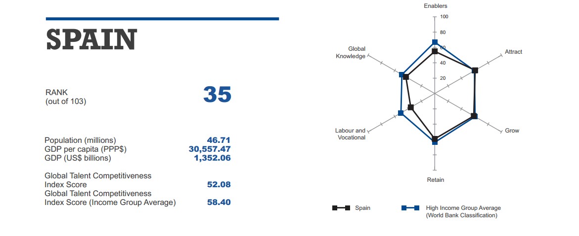 España se sitúa en el puesto 35 del ranking, por detrás de Corea del Sur, Chile o Polonia. Entre los aspectos negativos que hacen que España no tenga los mayores índices de retención del talento en las empresas son, entre otros, la poca flexibilidad del mercado laboral -ocupamos el puesto 88 del ranking-, bajos sueldos en relación con la productividad -puesto 98-, la dificultad de los jóvenes en acceder al mercado laboral - puesto 91- o la poca formación de los trabajadores -puesto 82-.