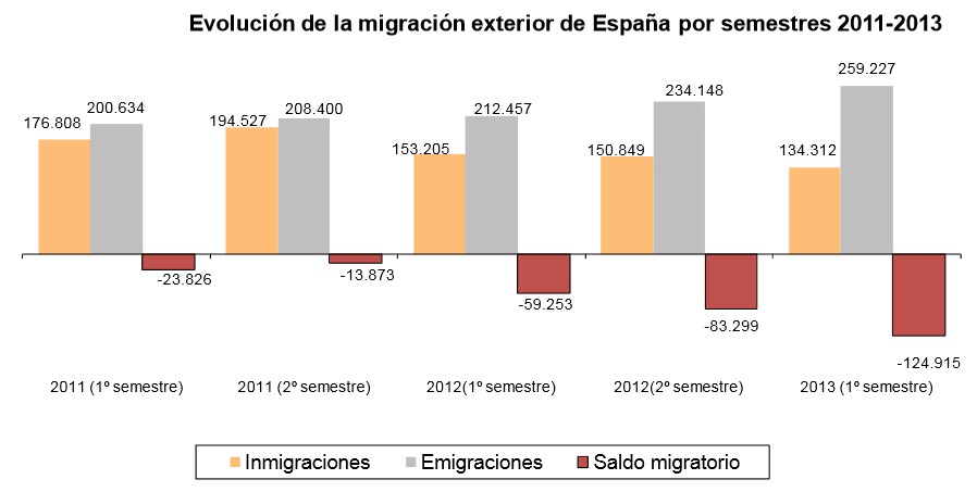 Este descenso fue fruto, por un lado, de un saldo vegetativo (nacimientos menos defunciones) positivo de 6.678 personas y, por otro, de un saldo migratorio negativo de -124.915 personas durante los seis primeros meses de 2013. Esta última variable significa que, hasta el pasado junio, 134.312 personas procedentes del exterior (inmigrantes) se establecieron en España, al tiempo que salían del país un total de 259.227 habitantes (emigrantes) en busca de un futuro mejor -algo más de 43.000 al mes en lo que va de año-.