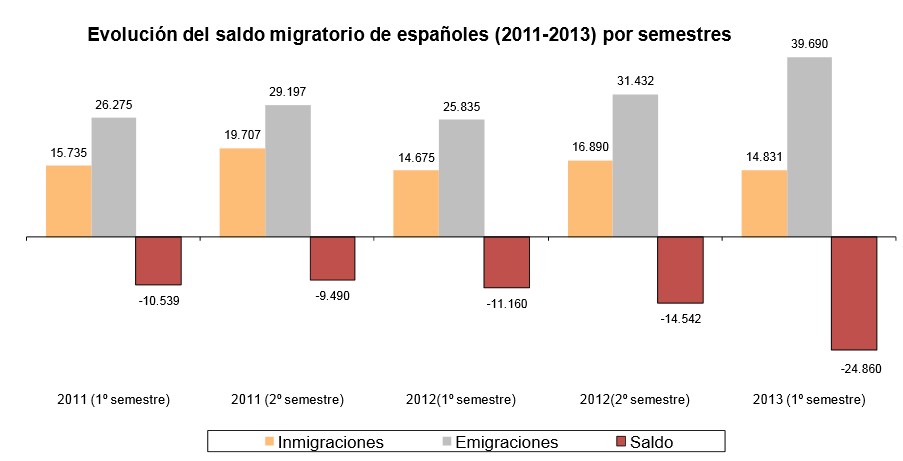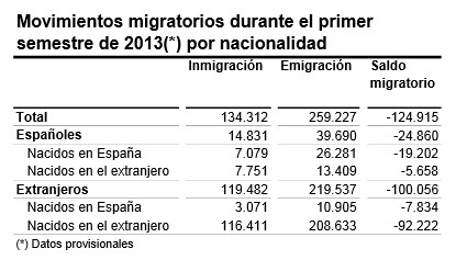 En cuanto al flujo migratorio de los españoles, el saldo negativo de nacionales (24.860) se ha disparado un 71% respecto al segundo semestre de 2012 debido, sobre todo, al aumento de las salidas. Dicho saldo se ha más que duplicado desde el primer semestre de 2011.