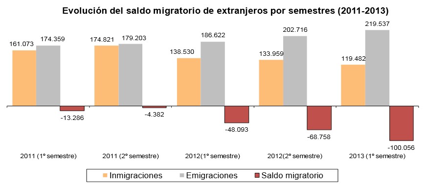 En cuanto al flujo migratorio de los extranjeros, se fueron 100.056 más de los que llegaron, lo que supone un incremento del 45,5% respecto al semestre anterior y casi 10 veces más que en el mismo período de 2011.