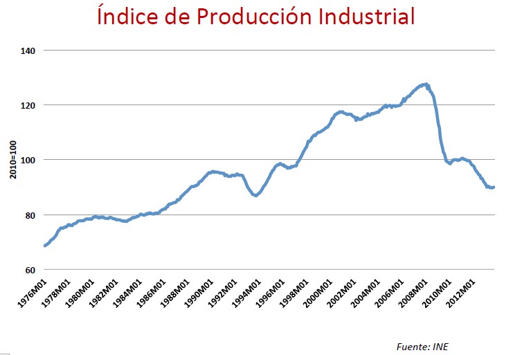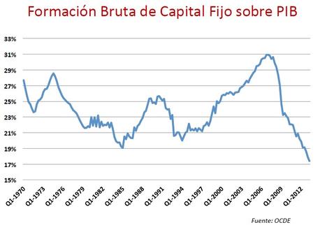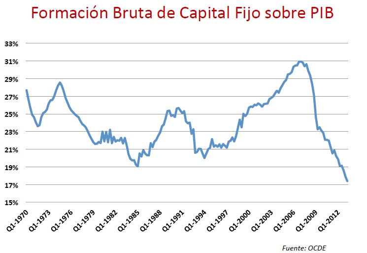 Los demás datos no son tan esperanzadores. Como puede verse en los siguientes gráficos, tanto el Índice de Producción Industrial, como la Formación Bruta de Capital Fijo sobre el PIB siguen muy lejos de nuestros mejores años. Éste último indicador, especialmente, es muy relevante a la hora de anticipar un crecimiento sostenido y sostenible a medio plazo, pues habla de inversión y confianza empresarial en el futuro.