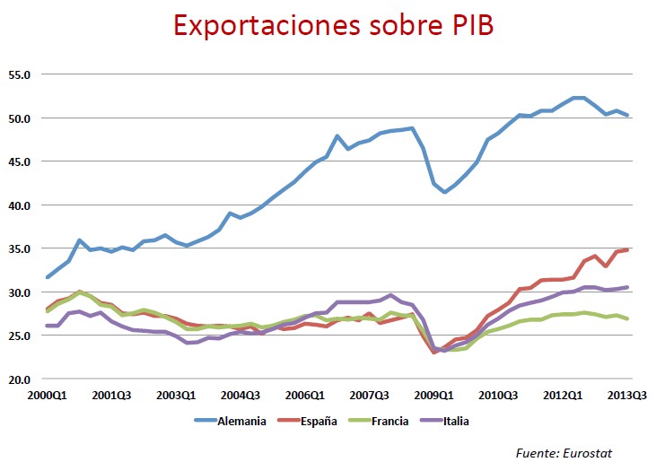 A esto puede añadirse la buena cifra en las exportaciones. Como puede verse en el siguiente gráfico, las ventas al exterior no sólo han crecido en términos absolutos, sino que también están ganando peso respecto al PIB nacional. En la comparación, España ya exporta un porcentaje del PIB superior al de Francia o Italia, una situación desconocida en las últimas décadas.