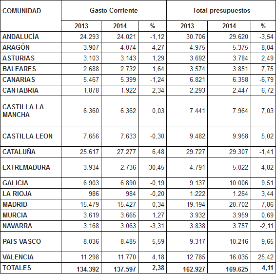 El País Vasco y Galicia le siguen a continuación, con incrementos superiores al nueve por ciento, mientras que la autonomía más austera el año próximo será Canarias, con una reducción de casi el siete por ciento respecto al presente ejercicio. Junto a ella, las únicas autonomías que reducirán en 2014 su gasto serán Andalucía, Cataluña y Navarra.