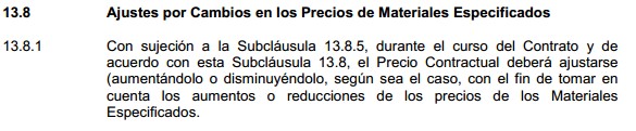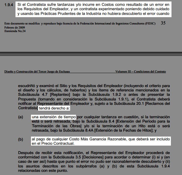 El primero de los supuestos en los que se reconoce esta posibilidad figura en el artículo 1.914 de las "condiciones del contrato" del documento base de licitación. En él se recoge que en caso de que el contratista (Sacyr) se vea obligado a incurrir en retrasos o incremento de costes por "un error en los requisitos del Empleador" (ACP), Sacyr tendría derecho "al pago de cualquier Costo Más Ganancia Razonable, que deberá ser incluido en el Precio Contractual" (sic).