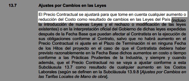 El documento base de licitación resulta tan exhaustivo que también recoge la posibilidad de que las propias leyes del país cambien durante el periodo que duren las obras y que puedan derivar en sobrecostes para la contratista.