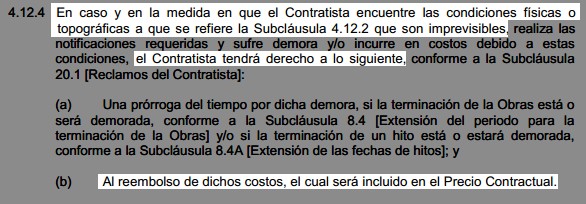 Por otro lado, el punto 4.12.4 de dichas "condiciones", compromete a la Autoridad del Canal a "reembolsar" a Sacyr los sobrecostes en los que ésta incurra por haber encontrado "condiciones físicas o topográficas" imprevisibles durante el desarrollo de las obras.