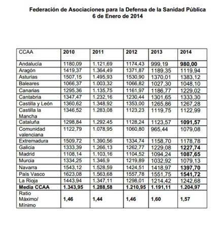Estos datos facilitados por Fadsp son consecuentes con un reciente informe del Ministerio de Hacienda, que señalaba que Cataluña y Andalucía eran las comunidades que porcentualmente recortarán este año más en sanidad y educación. Según este documento, la Generalitat recortará en su presupuesto para 2014 un 5,7% en sanidad y un 10,1% en educación, mientras que la Junta lo hará en un 2,1 y un 2,3, respectivamente.