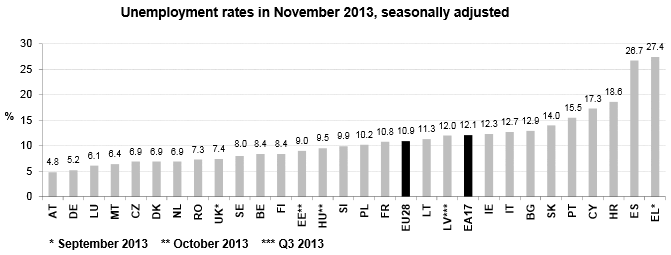 La cifra de desempleados registrada en la eurozona en noviembre alcanzó un total de 19,241 millones de personas, lo que supone un incremento de 4.000 parados respecto a octubre, mientras que en el conjunto de la UE la cifra de personas sin empleo alcanzó los 26,553 millones, un aumento de 19.000 parados respecto al mes anterior. No obstante, respecto a noviembre de 2012, el número de desempleados de la zona euro se incrementó en 452.000 personas, mientras que entre los Veintiocho aumentó en 278.000 desempleados.