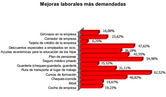 La empresa de trabajo temporal explica que los españoles han cambiado sus prioridades a la hora de definir sus condiciones y que un aumento de sueldo ya no es lo más importante para la mayoría como años atrás. Sólo para el 46% de los de los españoles una mejora de su retribución sería lo primero que le pediría a la compañía donde trabaja. Es especialmente significativa la cuantía de empleados que demandarían, antes que nada, cursillos de formación, el 21%.