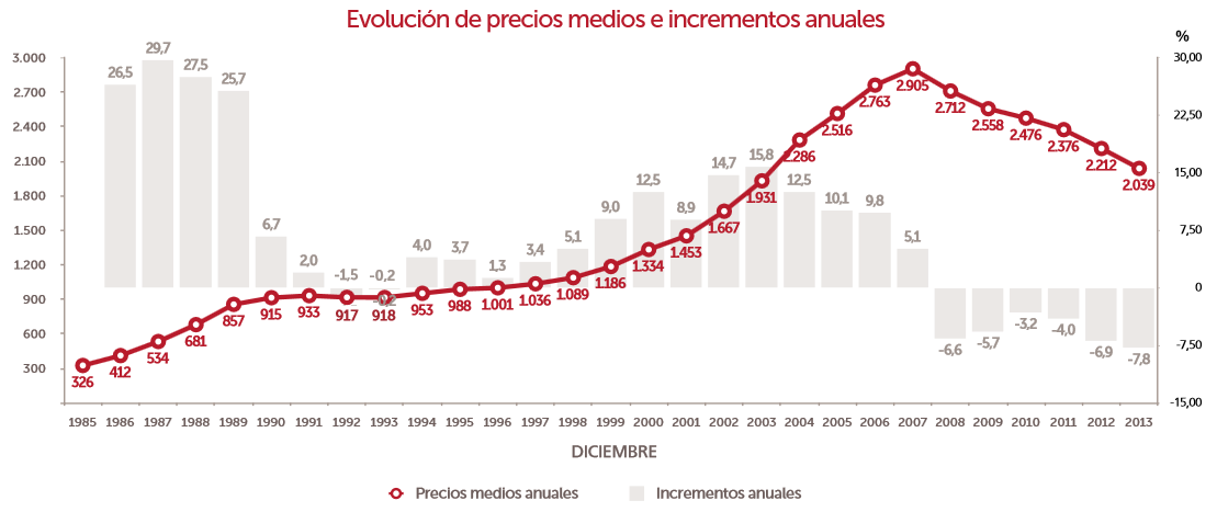 Por el contrario, el precio, siempre en términos nominales, se disparó más de un 190% entre 1996 y finales de 2007. Desde mediados de los años 90 hasta la actualidad, el valor medio casi se ha duplicado -sin descontar la inflación-.