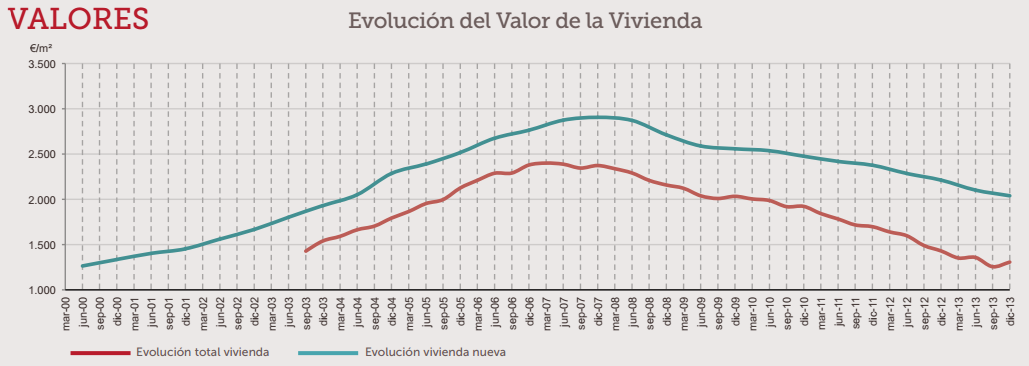 Desde principios de 1997 hasta finales de 1998, el precio medio de la vivienda aumentó trimestralmente a un ritmo de entre el 4% y el 8% interanual; desde entonces y hasta finales de 2006, la burbuja fue tomando cuerpo, con incrementos superiores al 10% interanual, alcanzando su particular cénit a finales de 2005 y principios de 2006, con subidas superiores al 13%; desde comienzos de 2007 a principios de 2008, los precios siguieron aumentando, pero a un ritmo mucho menor (2% interanual); finalmente, desde mediados de 2008 y, sobre todo, ya en 2009, el mercado comenzó a registrar tasas negativas a nivel interanual, una depreciación que se ha ido intensificando de forma progresiva durante la crisis.