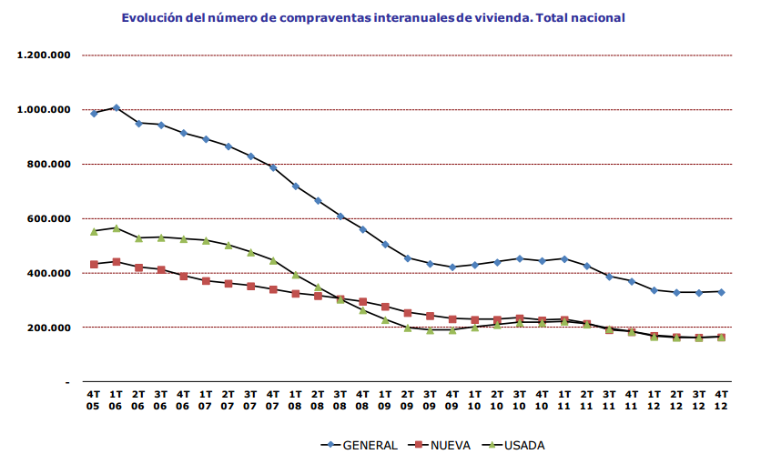 El aumento del paro, la restricción crediticia y la depreciación inmobiliaria también se han materializado en el hundimiento de la compraventa de pisos. El año pasado se cerró con cerca de 300.000 transacciones, a falta de conocerse el dato definitivo de diciembre, lo cual supone un descenso de casi el 70% frente al nivel máximo de compraventas registrado en 2006, con cerca de 1 millón de operaciones.