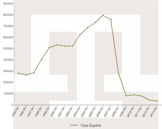 Otro de los efectos más visibles de la crisis ha sido, sin duda, el hundimiento de la construcción de vivienda y la consiguiente caída de promotores e inmobiliarias. Como muestra, basta señalar que España llegó a construir tantas viviendas como Francia, Alemania y Reino Unido juntos en los años de mayor auge crediticio, con casi 800.000 unidades en 2005 y otras tantas en 2006. En 2013, tan sólo se iniciaron 35.200, lo cual supone un desplome del 95,6% desde máximos.