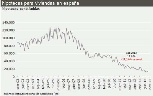 Destaca, igualmente, la evolución del mercado crediticio, tan vinculado al sector del ladrillo. El número de hipotecas constituidas sobre vivienda se situó en 14.704 el pasado octubre, según los últimos datos disponibles del INE, mientras que el importe medio concedido bajó hasta los 103.246 euros. A finales de 2006, por el contrario, el sistema financiero concedía 86.607 hipotecas al mes, con un importe medio de 144.000 euros. El número de hipotecas ha pasado de superar el millón a rondar apenas las 200.000 al año, un descenso próximo al 80%, mientras que el importe concedido ha bajado una media del 30%.