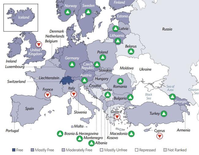 Dentro de este panorama general, Europa no es un caso especial. La mayoría de los países del Viejo Continente han mejorado sus calificaciones desde 1995. Es más, como puede verse en la imagen inferior, hasta 18 estados alcanzan en esta edición de 2014 la mejor nota de su historia. Sin embargo, cinco países aparecen en rojo. O lo que es lo mismo, con menos puntos este año que hace dos décadas. Son Grecia, Reino Unido, Francia, Italia y Chipre. Y si ampliamos un poco la lista y cogemos al siguiente por la cola aparece Portugal. El país luso no aparece en rojo porque desde 1995 ha subido un poco en la puntuación del ILE, pero es, dentro de los europeos en positivo, el que menos ha mejorado. Al final, tenemos a los PIGS casi al completo (España es la excepción) junto a Chipre (otro rescatado), Francia y el Reino Unido.