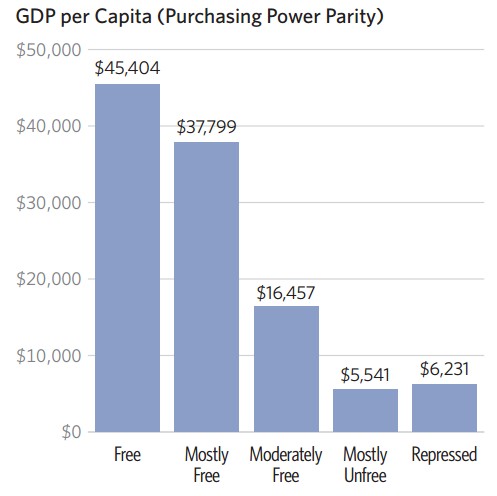 Enfrente, Corea del Norte, Cuba, Venezuela o Irán están en la lista de 26 economías que no alcanzan ni siquiera los 50 puntos en este ranking. Para ellos, el ILE reserva la última categoría de su escala: libre (de 80 a 100 puntos), mayormente libre (de 70 a 80), moderadamente libre (de 60 a 70), mayormente controlada (de 50 a 60) y reprimida (de 0 a 50). Pues bien, el PIB per cápita en estos 26 estados apenas alcanza los 6.231 dólares. O lo que es lo mismo, los países más libres son 7 veces más ricos que los muy intervencionistas.