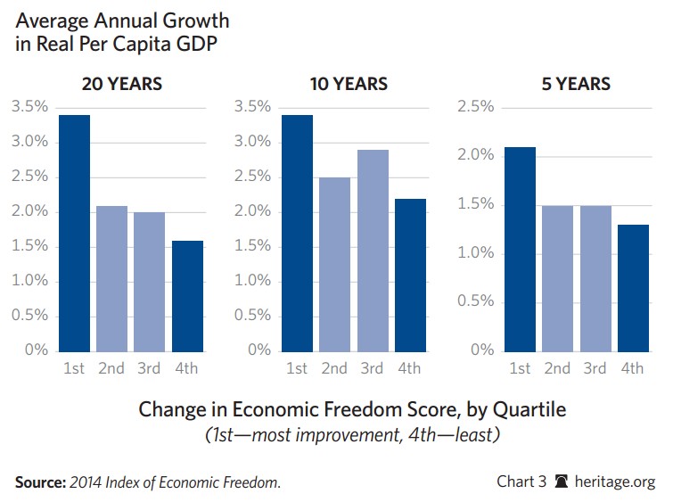 grandes grupos, en función de cuánto han mejorado sus notas desde la primera edición del índice en 1995. De nuevo, se cumple la relación libertad-prosperidad. Aquellos países en el primer cuartil de mejora han experimentado un crecimiento medio anual cercano al 3,5%; al mismo tiempo, aquellos que peor lo han hecho en estas dos décadas para el ILE apenas han crecido al 1,5% al año. Parece claro, con todos estos datos en la mano, que aquellos gobiernos que quieran que sus países prosperen tienen una solución relativamente sencilla: liberalizar sus economías.