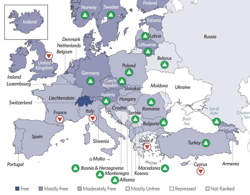 En el lado contrario, hay una serie de países que lo han hecho extraordinariamente bien en los últimos veinte años. No están en los primeros puestos, algo lógico puesto que la lista la encabezan pequeños estados que han sufrido muchas convulsiones en este período. Países como Bosnia, Azerbaijan o Georgia partían de posiciones muy retrasadas, por lo que cualquier medida liberalizadora les permite dar pasos agigantados, aunque eso no quiere decir que en todos los casos hablemos de economías libres en términos absolutos.