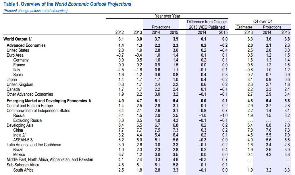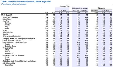 En lo que respecta al resto del mundo, podría decirse que el FMI es moderadamente optimista, aunque tampoco lanza las campanas al vuelo (ya hemos visto que para la cifra global apenas mejora una décima respecto a octubre). Para EEUU, su previsión es de crecimiento del 2,8% en 2014 y del 3,0% en 2015. Esto quiere decir que mejora su apuesta para este año pero empeora la que tenía para el que viene.