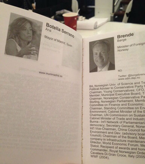 La alcaldesa de Madrid, Ana Botella, interviene este miércoles y jueves en el Foro Económico Mundial de la ciudad suiza de Davos en dos mesas, una sobre empleo y otra sobre urbanismo. Este miércoles, un diario nacional constata que la organización del Foro Mundial se ha olvidado incluir en el folleto de participantes el currículum tanto de Ana Botella como del ministro Soria, que aparecen en blanco.