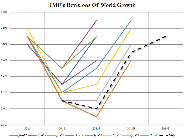 Lo mismo se puede decir respecto a las previsiones de crecimiento global. El FMI estima ahora que la economía mundial creció un 3% en 2013 y avanzará un 3,7% este año, frente al 4,1% y 4,4% pronosticado en abril de 2012, lo que supone un desvío del 27% y el 16% a la baja.
