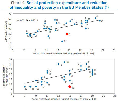 14. Protección social: siempre hay que tomar estos datos con precaución. Pero hay una cuestión interesante, los políticos españoles se niegan a introducir ningún cambio en políticas activas de empleo, subsidios de paro o formación con la excusa de que es un gasto "social". Puede que lo sea, pero también es inútil. España es el país de Europa que menos rendimiento saca a este tipo de gasto. Sus efectos redistributivos (de los que presumen nuestros líderes) son muy reducidos. Ni siquiera para eso sirve el dispendio.
