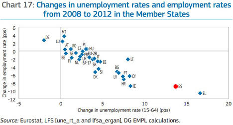 1. Cambio en las tasas de empleo y desempleo de 2008 a 2012. La imagen de la crisis. España (en rojo, como en el resto de imágenes) sólo tiene peores cifras que Grecia. No sólo sube el paro, tampoco se genera actividad o empleos nuevos.