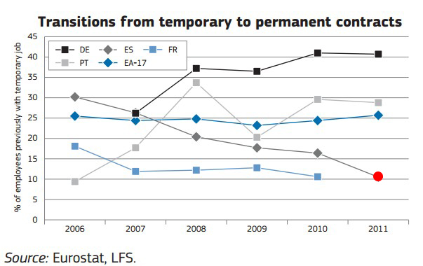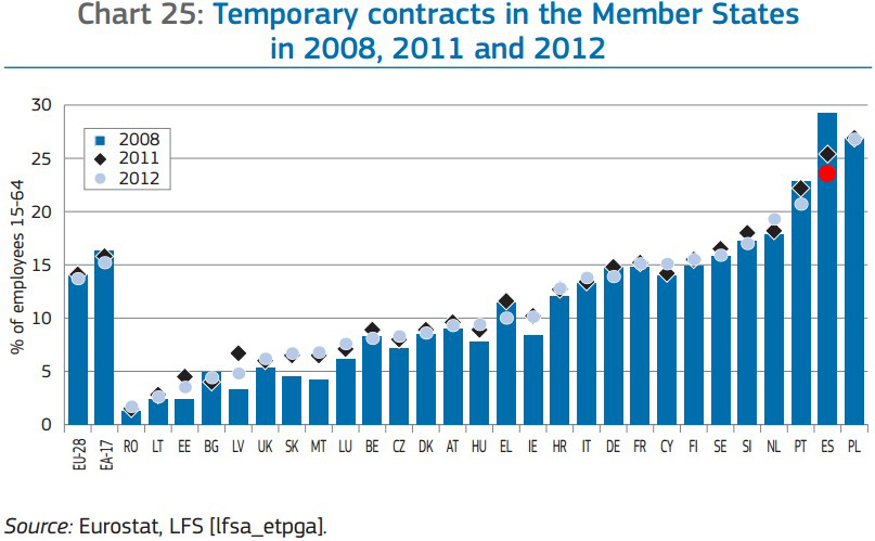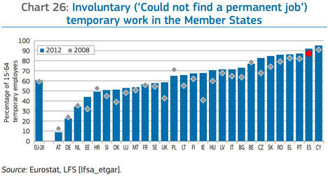 6. Proporción de temporalidad involuntaria: en muchos casos, la temporalidad puede ser una elección. Tanto al empleado como a la empresa le puede venir bien un trabajo sólo por unos meses (para cubrir un pico de demanda o sacarse unos ahorrillos). No es el caso de España. La mayoría de los temporales querrían ser fijos, pero no pueden.