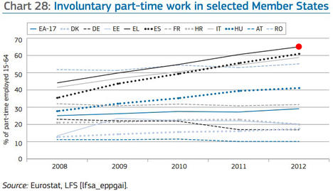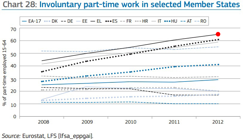 8. Contratos a tiempo parcial no queridos: lo mismo que con la temporalidad, lo malo de los contratos a tiempo parcial no es que existan, sino cuando los ocupan trabajadores sólo porque no tienen otro remedio. También en esto España destaca (es la segunda con mayor porcentaje).
