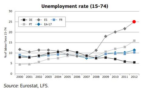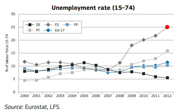 2. Tasa total de desempleo: en la comparación con los países de nuestro entorno (Alemania, Francia, Portugal y la media de la Eurozona) tampoco salimos bien parados. Y eso que a mediados de los años 2000 España no estaba lejos de sus vecinos. Ahora parece sólo un espejismo.