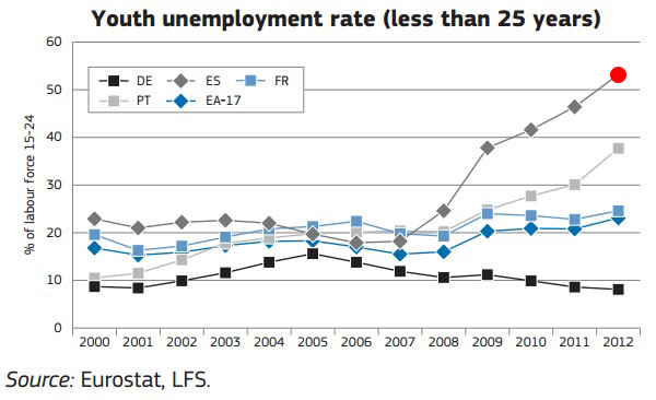 10. Paro entre los menores de 25 años: aquellos jóvenes que acaban de terminar sus estudios (universitarios, FP, instituto,...) y quieren un empleo saben que tienen más de la mitad de posibilidades de acabar en el paro.