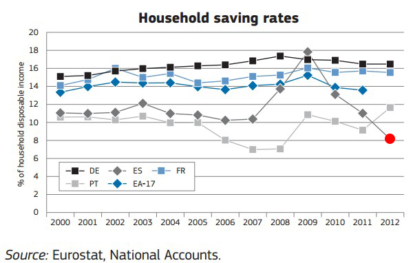 13. Tasa de ahorro de los hogares: no es directamente un gráfico de mercado laboral, pero explica muchas cosas. La tasa de ingresos disponibles de los hogares españoles se ha desplomado. Llegar a fin de mes cada vez es más difícil.
