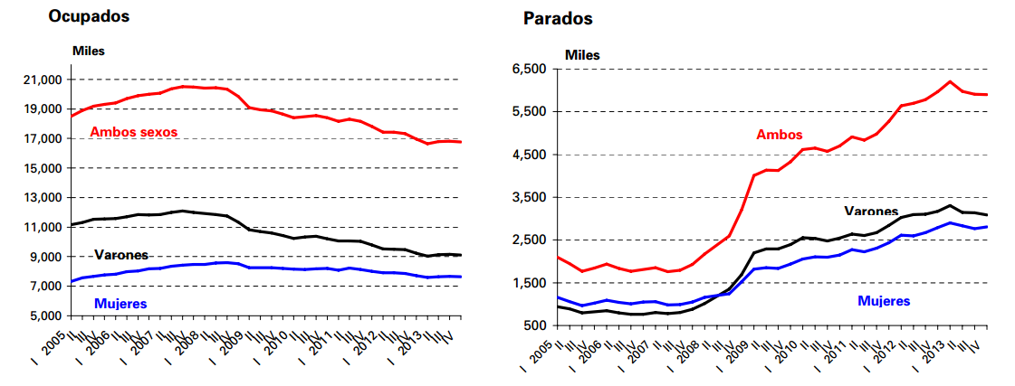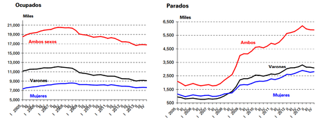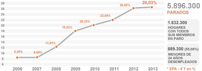 Dicho descenso explica que la tasa de paro haya aumentado en 2013. Así, pese a que el número total de desempleados bajó en 69.000 personas, la tasa de paro escaló hasta el 26,03% el pasado año, una décima más que al cierre de 2012. Es decir, el desempleo aumentó en términos relativos. Esta cifra revela que la reducción de parados no se debe a la creación de empleo, ya que el volumen de ocupados también baja, sino a la caída de la población activa. La población activa (-267.900) baja más que la ocupación (-198.900), lo cual explica el menor número de parados (-69.000).