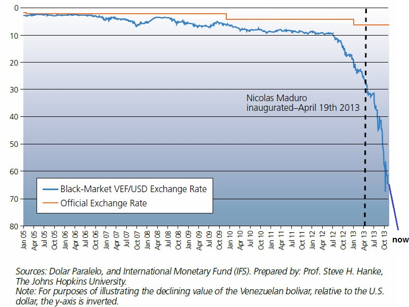 La desconfianza hacia su moneda es total. Nadie quiere bolívares. Los venezolanos sólo buscan dólares, euros o bien oro. El valor del bolívar no encuentra suelo: el tipo de cambio oficial es de 6,3 bolívares por dólar y de 11,36 para los turistas extranjeros, pero su cambio real en el mercado negro es de casi 80 bolívares por dólar. Los analistas también prevén fuertes devaluaciones del cambio oficial a corto plazo en el vecino paraíso socialista.