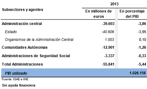 En concreto, el Gobierno central acumuló un agujero de 39.603 millones (3,86% del PIB), en el caso de las CCAA fue de 12.901 millones (1,26%), mientras que la Seguridad Social registró otros 3.337 (0,33%). Estos datos no incluyen el déficit de las corporaciones locales, pero su impacto debería ser neutro sobre el resultado final, ya que el propio Gobierno estima que cerrarán 2013 en equilibrio presupuestario.