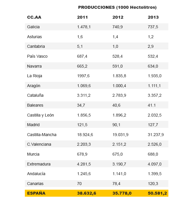 Volviendo a España, por Comunidades Autónomas, Castilla-La Mancha habría registrado el mayor aumento del último año. La región, ha pasado de producir 19 millones de hectolitros a 31,2 millones, un 64,1% más que el pasado año. Le siguen en crecimiento, Extremadura que con un aumento del 28,4%, superando ligeramente los 4 millones de hectolitros y Cataluña, cuya producción habría aumentado un 20,6% hasta los 3,4 millones de hectolitros. De entre todas las comunidades autónomas, sólo Galicia y Asturias registran caídas de la producción respecto a años anteriores.