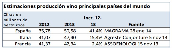 La Asociación de Enólogos italianos ha anunciado una vendimia en el país transalpino entre los 47 y los 48 millones de hectolitros, con subida del 15,4% respecto al periodo año anterior y aumentos en todas las regiones a excepción de la Toscana Sur, Umbría y el Lazio. Por otro lado, Francia logró aumentar su producción un 2,4% respecto de la cosecha de 2012, pero no logró superar a Italia.