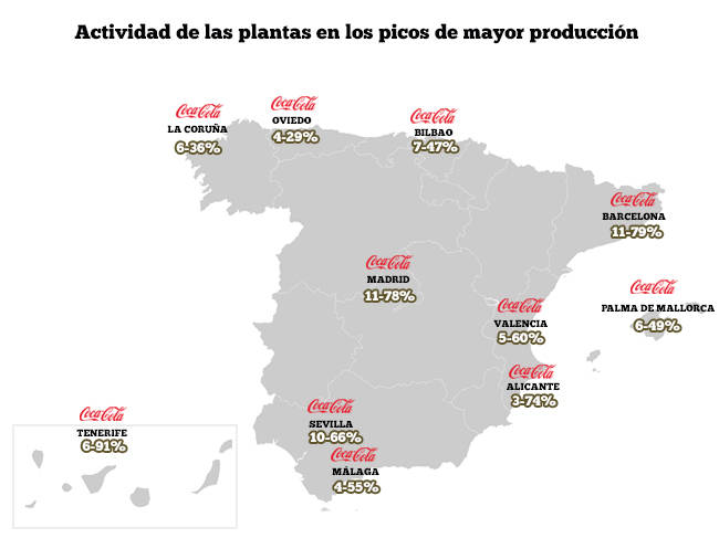 Tras el cierre de las cuatro fábricas, el resto de plantas de producción están alineadas de forma circular, racionalizando las plantas de la cornisa cantábrica y Levante‐Baleares y capturando sinergias en costes derivadas de la zona centro. Tenerife se mantiene por criterios logísticos y de servicio.