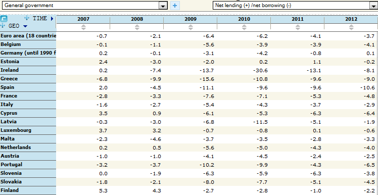 Pero es que, ni siquiera así se trata de un gran ajuste. Una vez eliminado el rescate de las cajas, el déficit bajó del 9,07% del PIB en 2011 al 6,84% en 2012, lo cual supone una reducción de 2,23 puntos porcentuales. Tal y como se puede comprobar en el anterior cuadro, se trata de una cifra muy inferior a Irlanda (casi 5 puntos menos) y similar a Eslovenia (-2,5) y Letonia (-2,3 puntos).