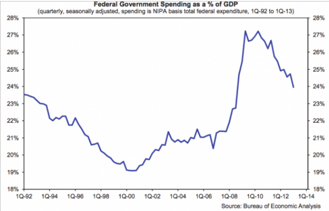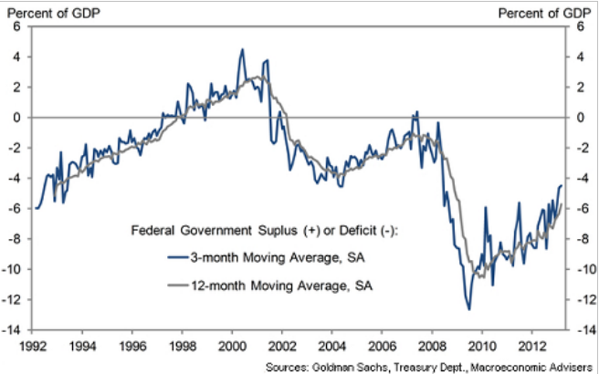 Como muestra la gráfica siguiente, el déficit federal que llegó a rondar el 10% del PIB ha caído intensamente desde 2010. Está previsto que el descuadre presupuestario sea del 3% del PIB cuando se cierren las cuentas de 2013.